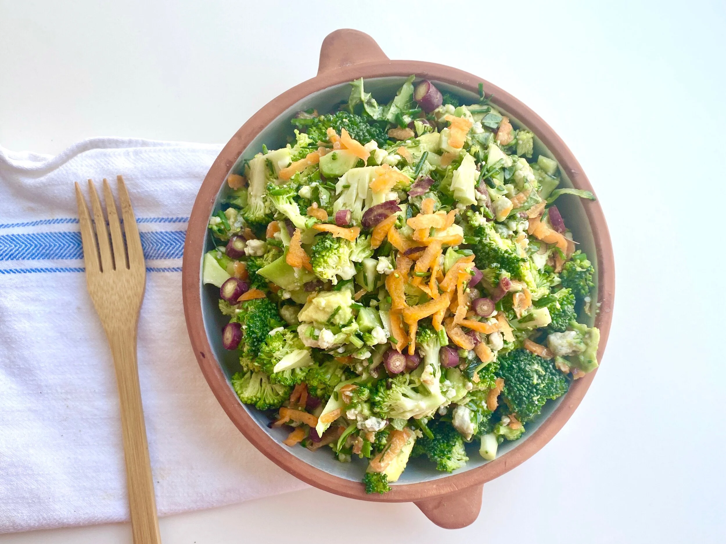 Cut broccoli into small, bite-sized pieces and place into a medium-sized bowl. Use a grate to cut as many carrots as you’d like and add to bowl. Chop up your herbs (I used chives and basil), and add to bowl. Take one avocado, cut into pieces, and - you guessed it - add to your bowl. Toss with olive oil, sea salt, and lime juice. Top with gorgonzola cheese, mix again, and serve!