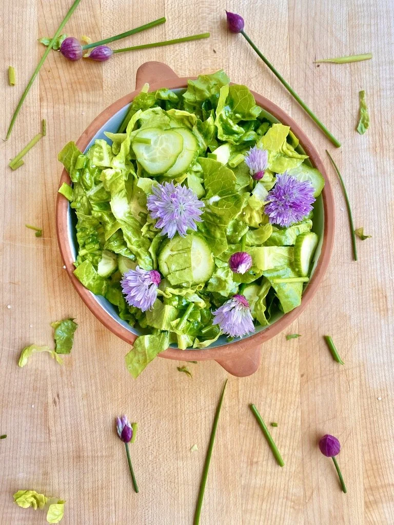 Chop the cucumbers, chives, and lettuce. To make the dressing, combine the lemon, olive oil, yogurt, and salt into a small bowl. Add the dressing onto the greens. Toss and serve!