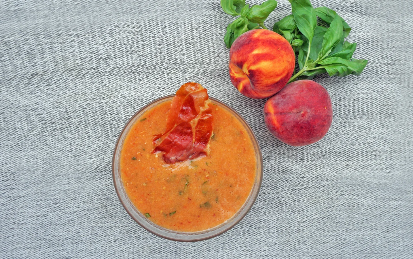 Can we just shout from the rooftops about stone fruit season? It's my favorite time of year and I'll find any excuse to throw a peach in something. And luckily it makes a pretty incredible addition to your average gazpacho - a hint of that juicy flavor complements peak tomatoes perfectly. And the bonus is this requires so little effort. Throw in that prosciutto chip and you'll have the perfect start to any summer meal.